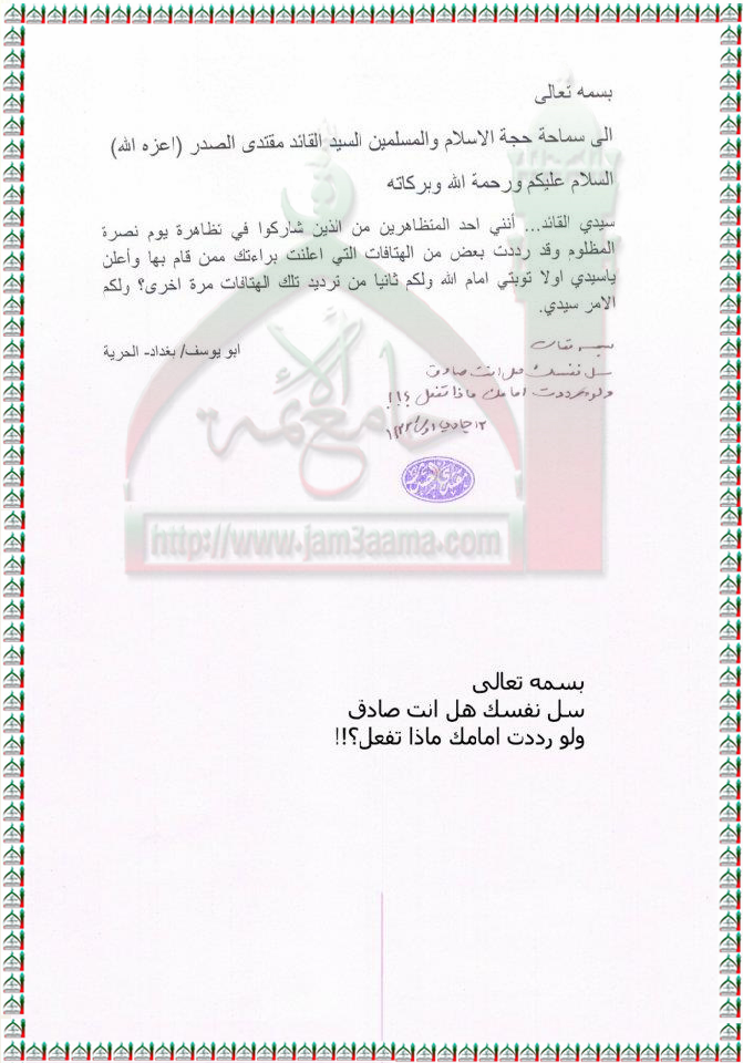 التوبة من الهتافات الممنوعة التي رددت من البعض في تظاهرة يوم نصرة المظلوم في البصرة استفتاء السيد القائد مقتدى الصدر اعزه الله 8 - 4 - 2012