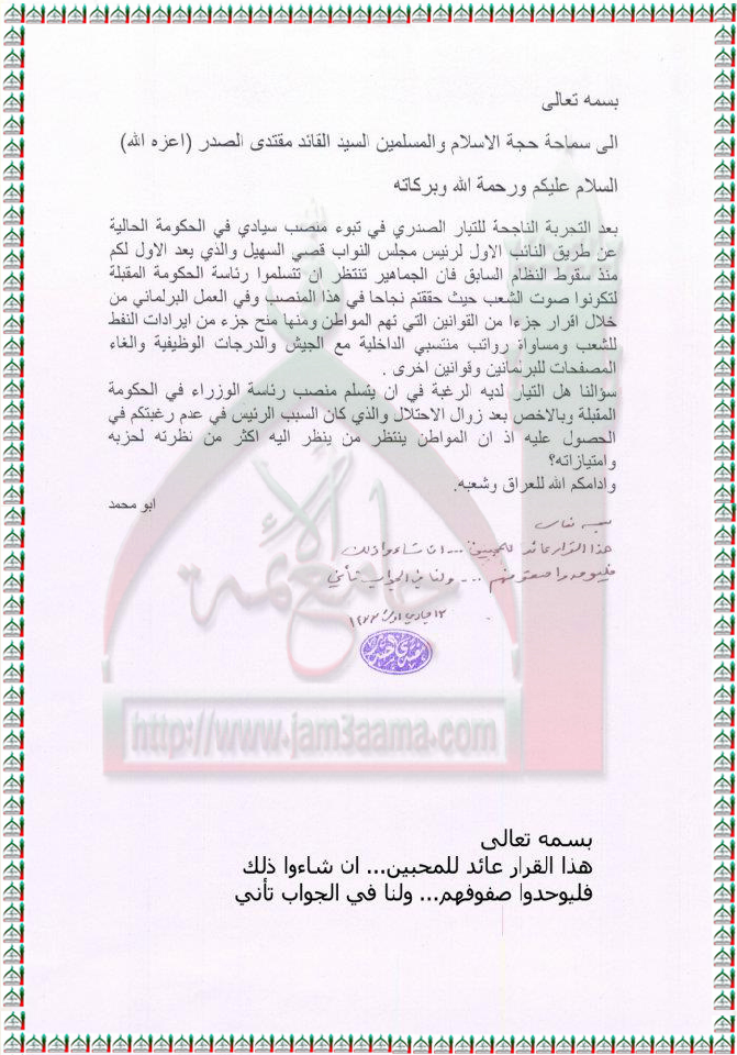 مدى رغبة التيار في الترشح لمنصب رئاسة الوزراء استفتاء السيد القائد مقتدى الصدر اعزه الله 8 - 4 - 2012