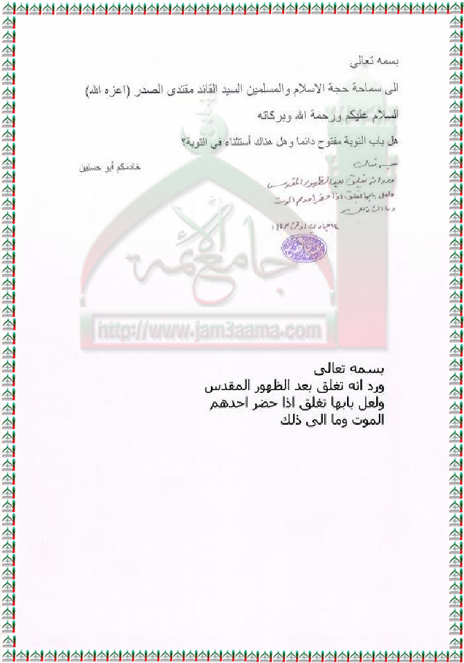 الحالات التي يغلق فيها باب التوبة أستفتاء السيد القائد مقتدى الصدر اعزه الله 9 - 4 - 2012