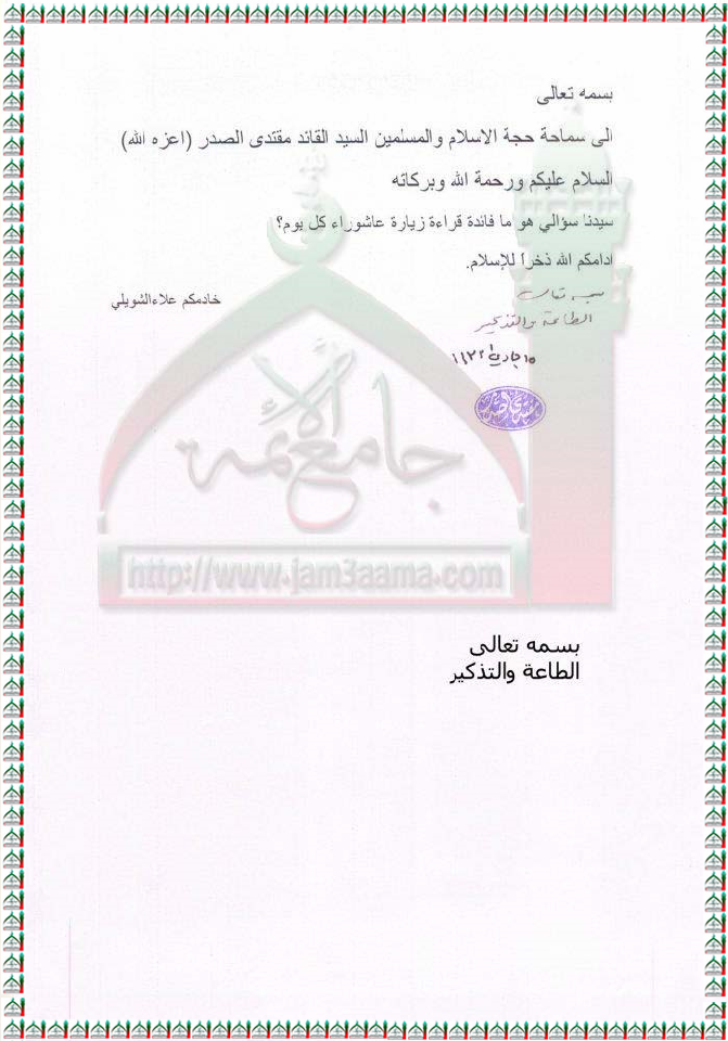 فائدة قراءة زيارة عاشوراء في كل يوم استفتاء السيد القائد مقتدى الصدر اعزه الله 9- 4 - 2012