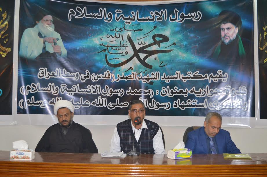 أقام مكتب السيد الشهيد الصدر (قدس سره) في وسط العراق ندوة حوارية بعنوان (محمد رسول الإنسانية والسلام) في محافظة بابل، بالتنسيق مع القسم الثقافي للمكتب الشريف. وابتدأت الندوة بقراءة آيات من الذكر الحكيم، تلاها كلمة مدير المكتب الشريف والتي ذكر فيها السيرة العطرة لسيد الرسل (صلى الله عليه واله) وربطها بمشروع الإصلاح الذي تبناه الزعيم العراقي السيد مقتدى الصدر. بعدها طرح الأستاذ وجدي العزاوي بحثه بعنوان (القيم التربوية من الأحاديث النبوية) والتي ذكر فيها جملة من الأحاديث المروية عن النبي الأكرم (صلى الله عليه واله)، ثم تطرق الدكتور علاء الطالقاني في كلمته إلى فضائل وأخلاق النبي الأكرم (صلى الله عليه واله) وتعامله مع الأمة جمعاء دون تمييز. وشارك في الندوة عدد من الشخصيات الدينية والعشائرية ونخبة من والأكاديميين والمثقفين وجمع غفير من المؤمنين. ![]() ![]() ![]() ![]() ![]() ![]()