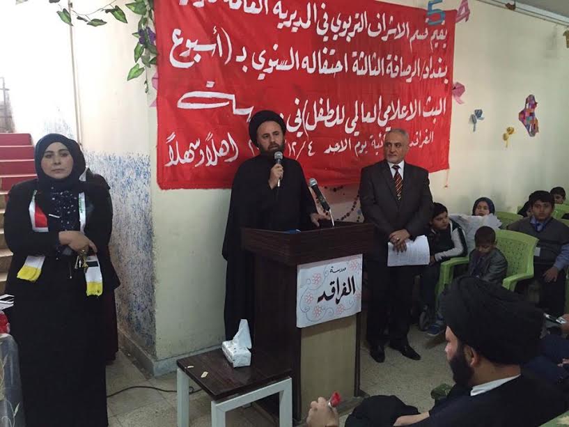 شارك مدير مكتب السيد الشهيد الصدر (قدس سره) في بغداد والمحافظات الشمالية الاحتفالية التي اقامتها مديرية تربية الرصافة الثالثة ببغداد بمناسبة أسبوع البث الإعلامي العالمي للطفل وذلك في مدرسة الفراقد، بحضور نائب رئيس القسم الثقافي للمكتب الشريف وعدد من الشخصيات الدينية والثقافية والوجهاء والكوادر التربوية في المديرية. وألقى مدير المكتب الشريف كلمة في الاحتفالية هنأ من خلالها الشريحة التربوية بهذه المناسبة، مشيراً من خلالها الى ضرورة شحذ الهمم للارتقاء بواقع التعليم لأجل ضمان مستقبل مشرق تسود فيه ثقافة التحضر والإنسانية بالعلم والعمل. هذا وتضمنت الاحتفالية فعاليات مختلفة وقدم عرض مسرحي اداه عدد من الأطفال أمام الحضور، كما وزعت هدايا تكريمية بهذه المناسبة على بعض التلاميذ المتفوقين وزعها مدير المكتب الشريف وعدد من الشخصيات الحاضرة. ![]() ![]() ![]()
