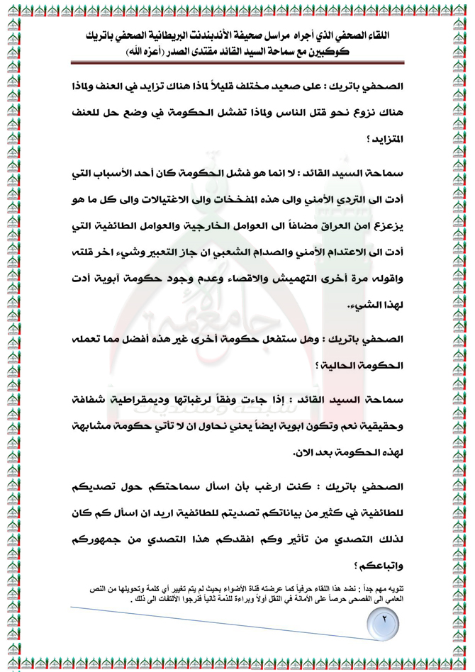 رد: نسخة منضدة من لقاء سماحة السيد القائد مقتدى الصدر مع الصحفي باتريك من صحيفة الأندبندنت البريطانية