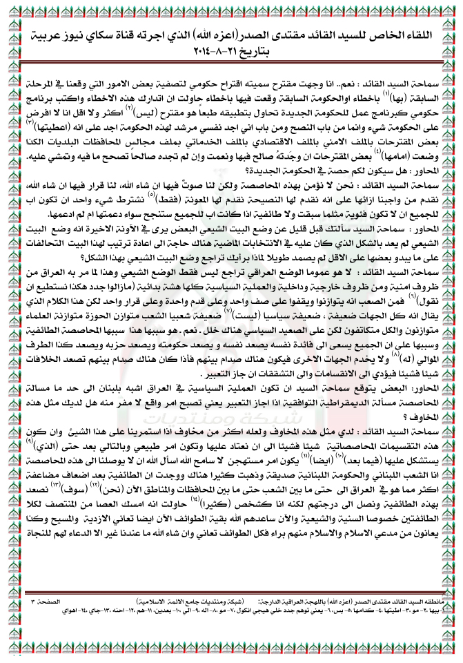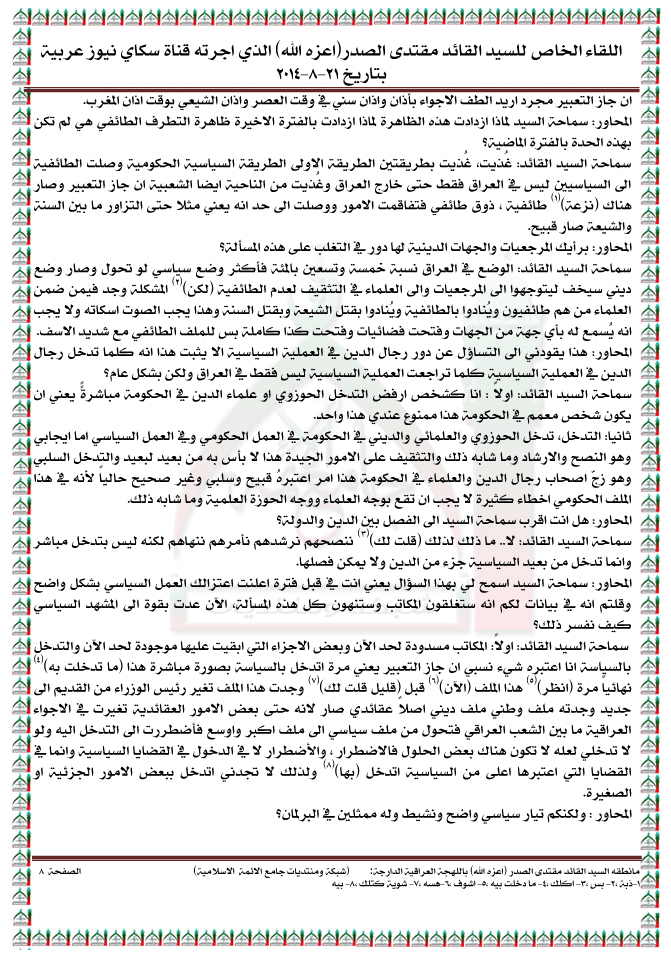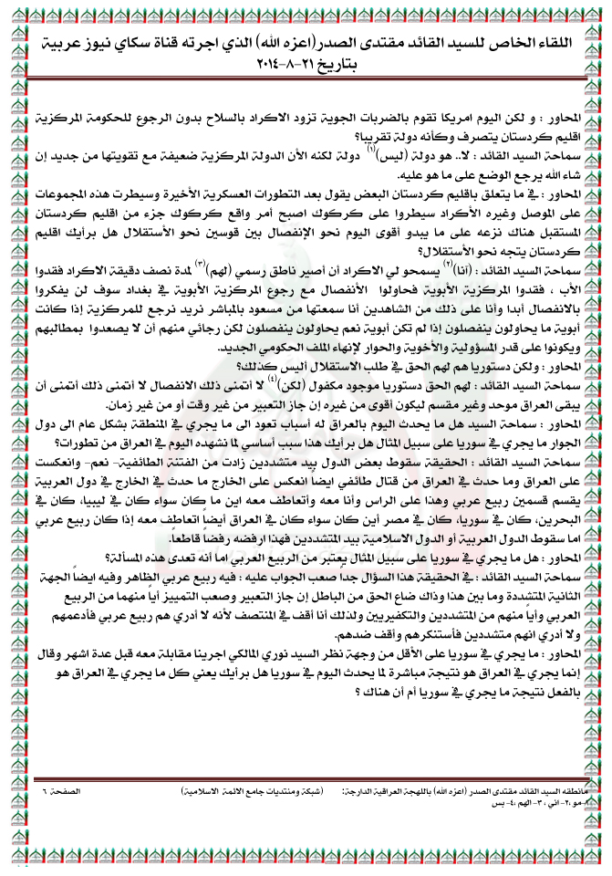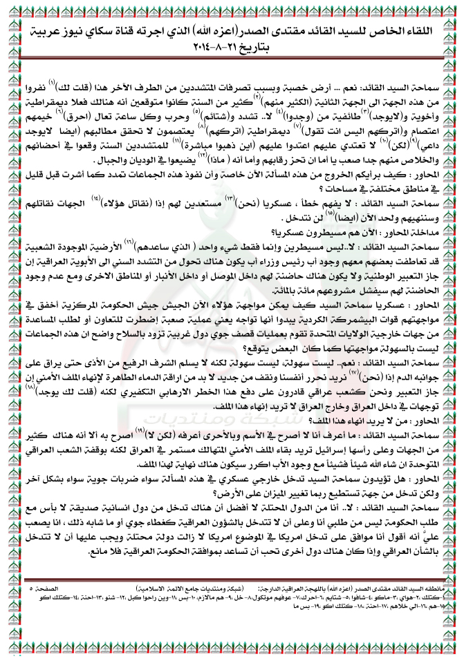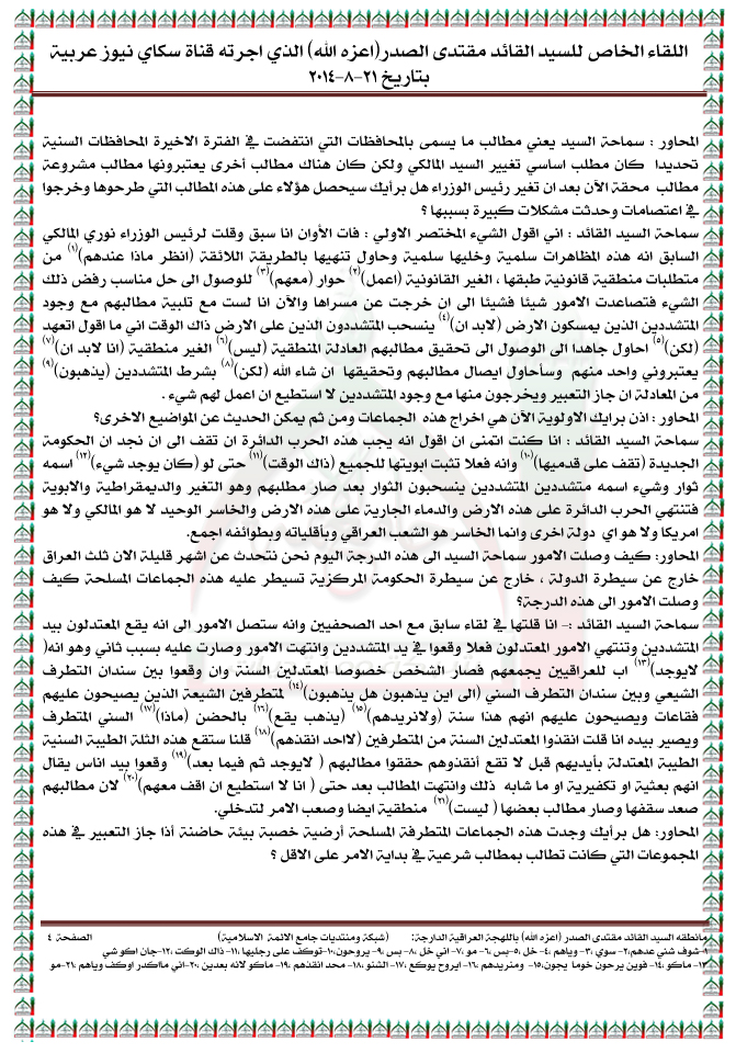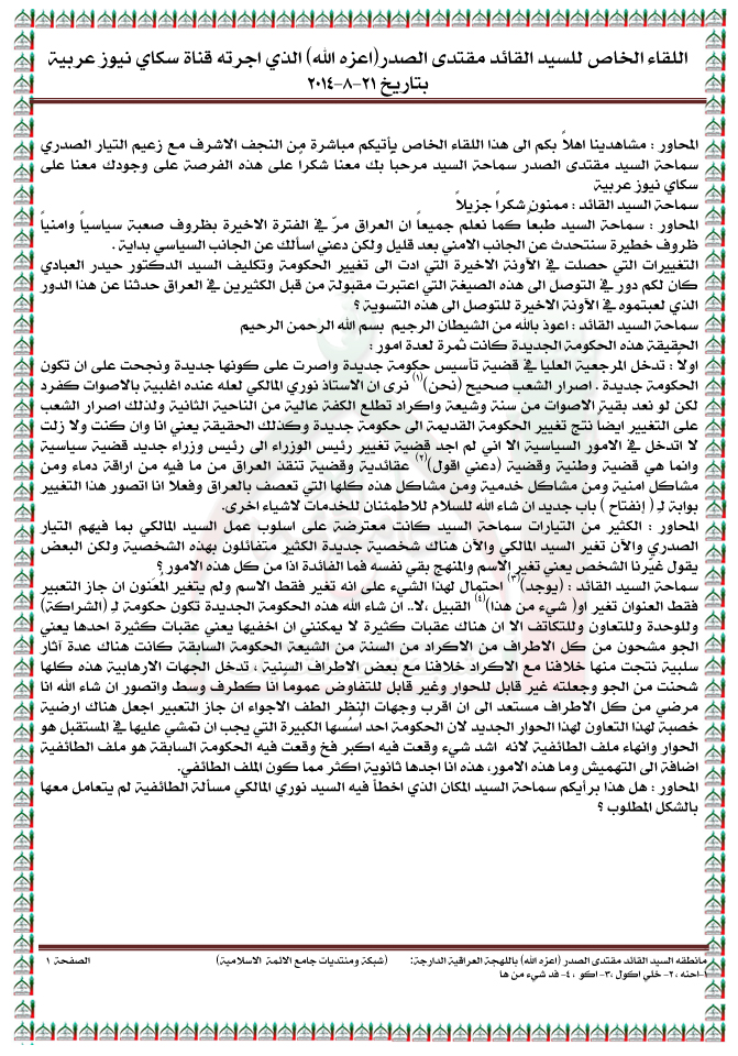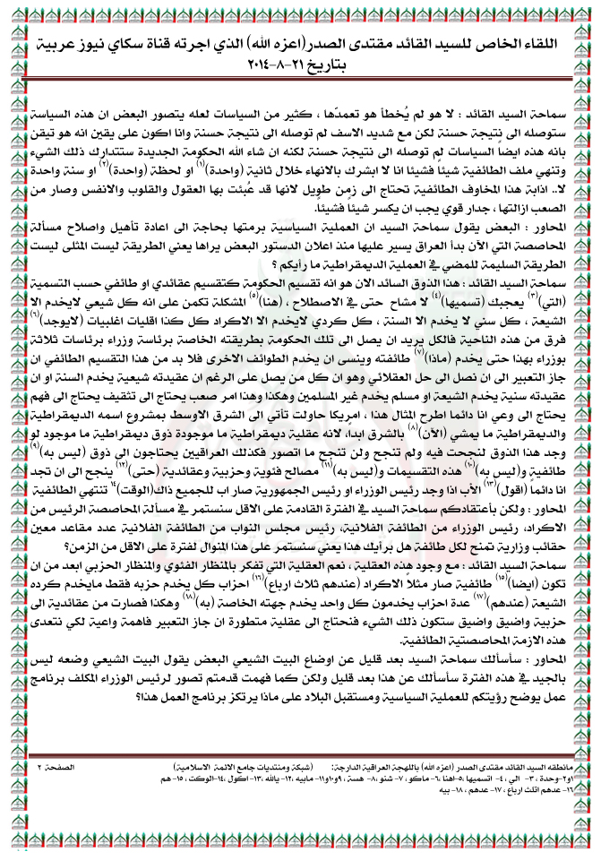 نص اللقاء الخاص للسيد القائد مقتدى الصدر (اعزه الله) الذي اجرته قناة سكاي نيوز عربية بتاريخ 21-8-2014