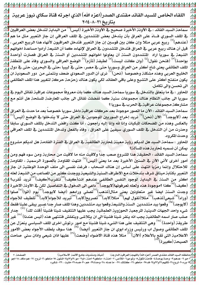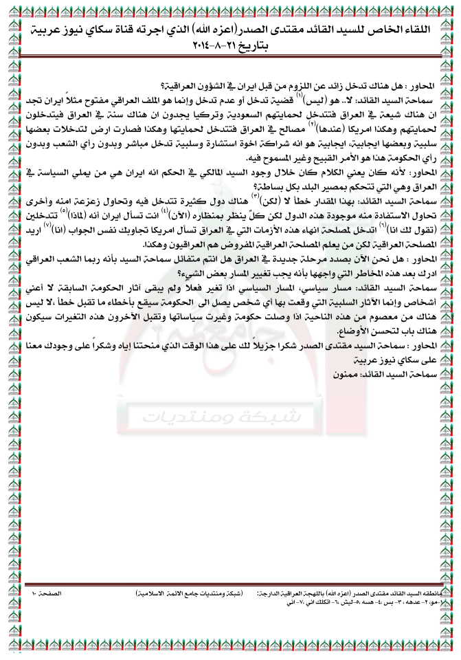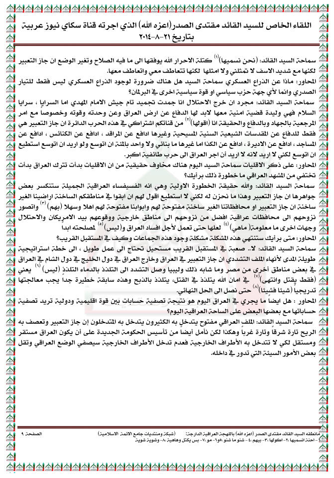 رد: نص اللقاء الخاص للسيد القائد مقتدى الصدر (اعزه الله) الذي اجرته قناة سكاي نيوز عربية بتاريخ 21-8-2014