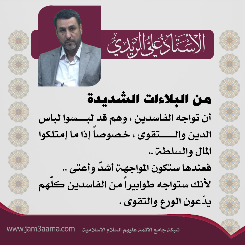 من البلاءات الشديدة مواجهة الفاسدين المتلبسين بلباس الدين والتقوى ... / الاستاذ علي الزيدي