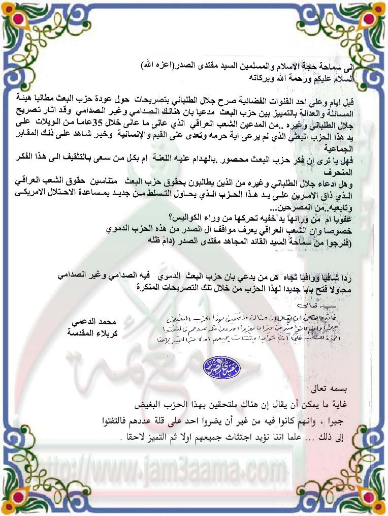 نؤيد اجتثات البعثيين(استفتاء للسيد القائد بتاريخ 1-2-2011)