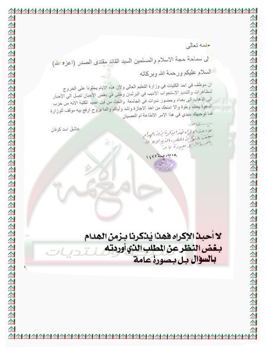 استخدام الاكراه للطلاب في احدى الكليات للتظاهر استفتاء السيد القائد مقتدى الصدر اعزه الله 12 - 5 - 2012