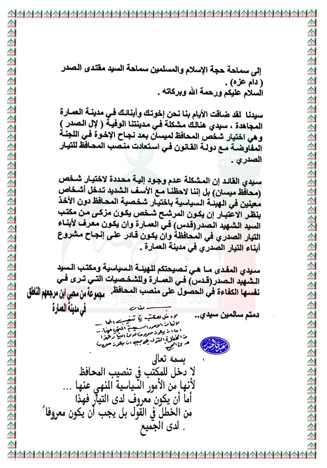 اختيار محافظ ميساناستفتاء سماحة السيد القائد مقتدى الصدر ( اعزه الله ) 19 - 2 - 2011