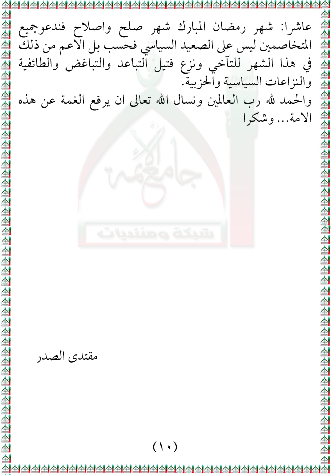 رد: نص الخطبة المركزية لصلاة الجمعة ( منضدة ) بقلم السيد القائد مقتدى الصدر اعزه الله 5 - 7 - 2013