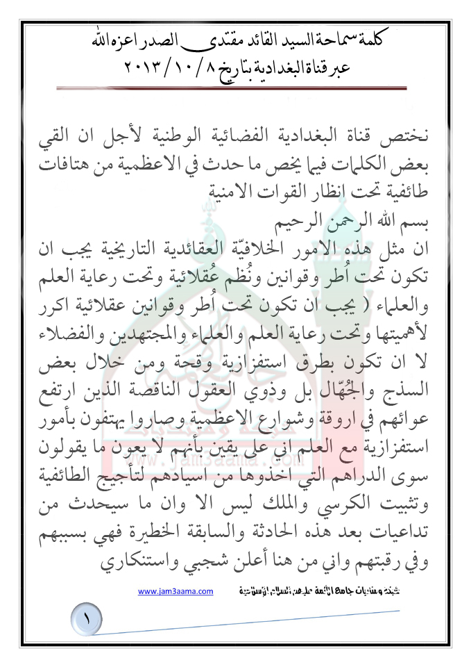 كلمة السيد القائد مقتدى الصدر اعزه الله حول ما صدر من هتافات طائفية في الاعظمية ( منضدة )