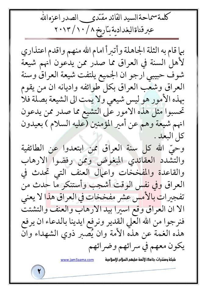 رد: كلمة السيد القائد مقتدى الصدر اعزه الله حول ما صدر من هتافات طائفية في الاعظمية ( منضدة )