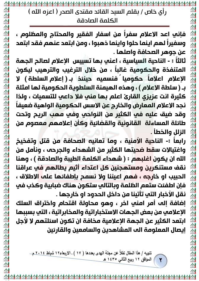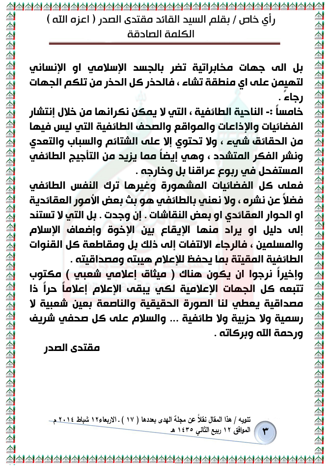 ( الكلمة الصادقة ) رأي خاص بقلم السيد القائد مقتدى الصدر اعزه الله