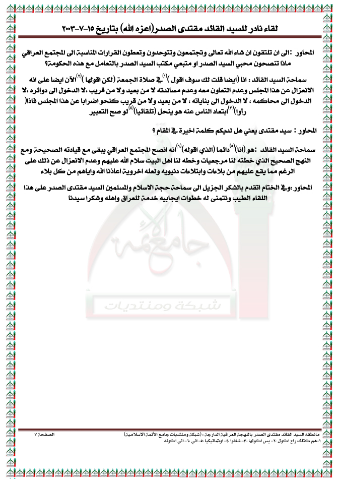 رد: نص اللقاء النادر للسيد القائد مقتدى الصدر(اعزه الله) بتاريخ 15-7-2003