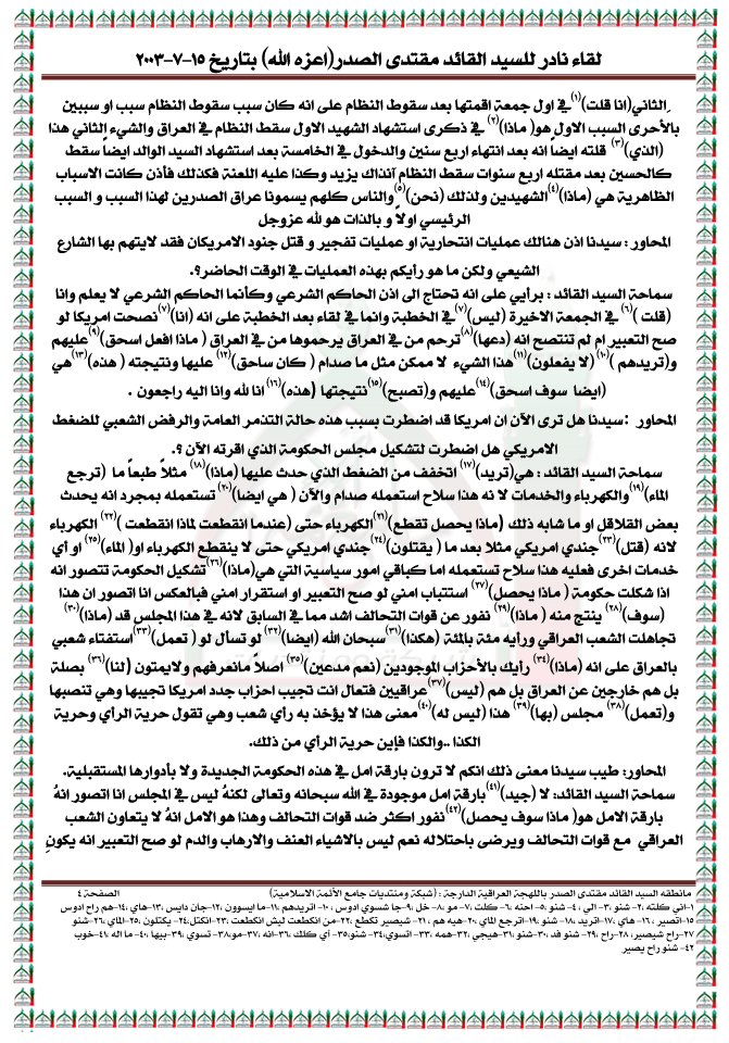 نص اللقاء النادر للسيد القائد مقتدى الصدر(اعزه الله) بتاريخ 15-7-2003