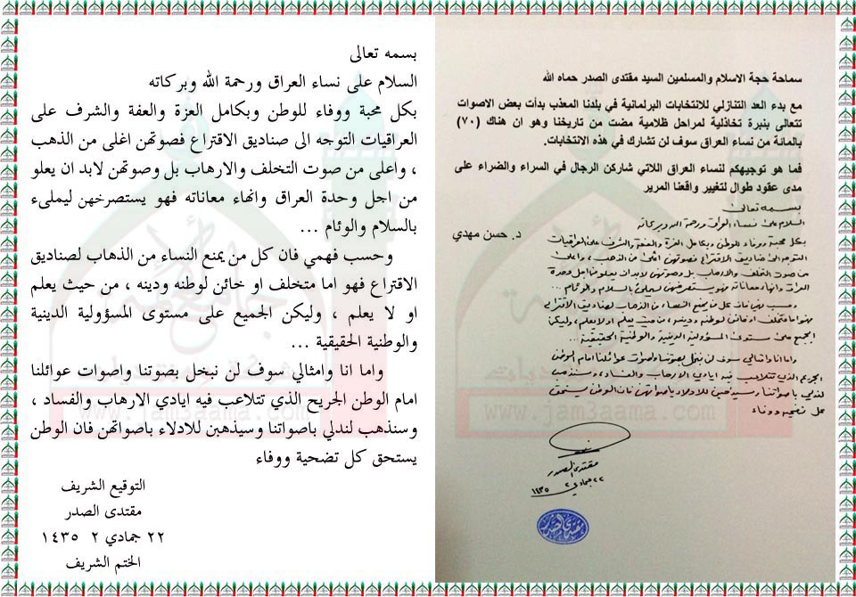 على العراقيات التوجه الى صناديق الاقتراع استفتاء السيد القائد مقتدى الصدر اعزه الله 22 - 04 - 2014