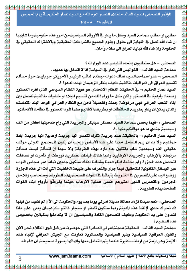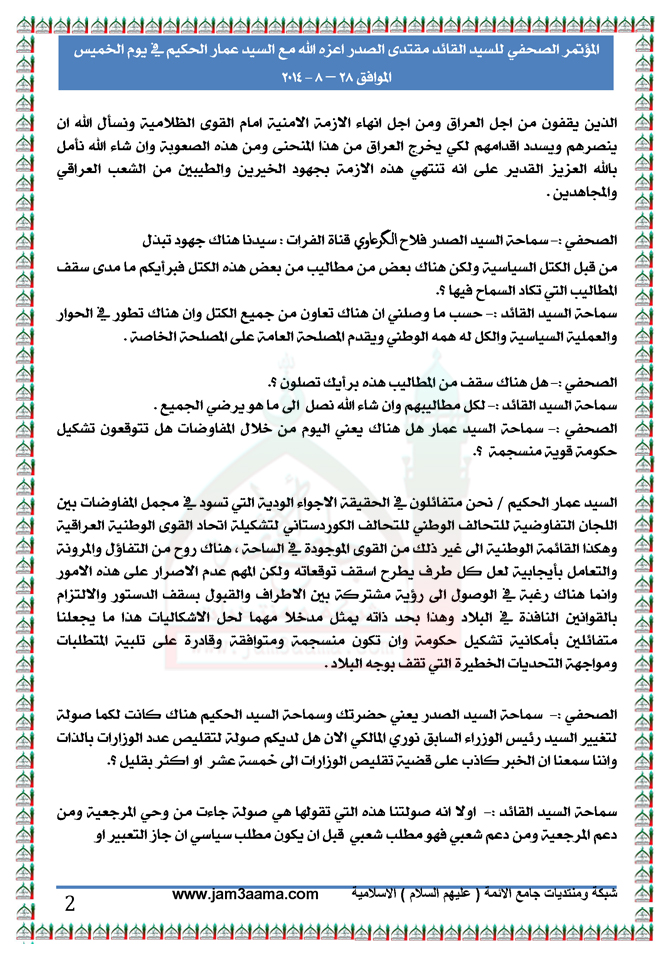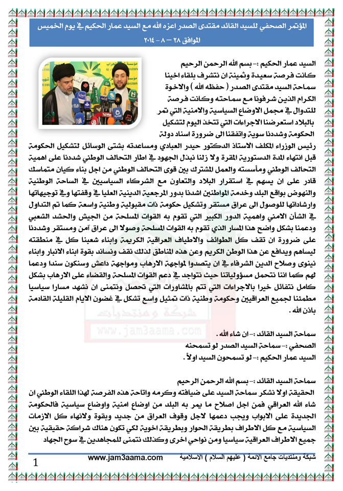 رد: نص المؤتمر الصحفي للسيد القائد مقتدى الصدر اعزه الله مع السيد عمار الحكيم بتأريخ 28 - 8 - 2014