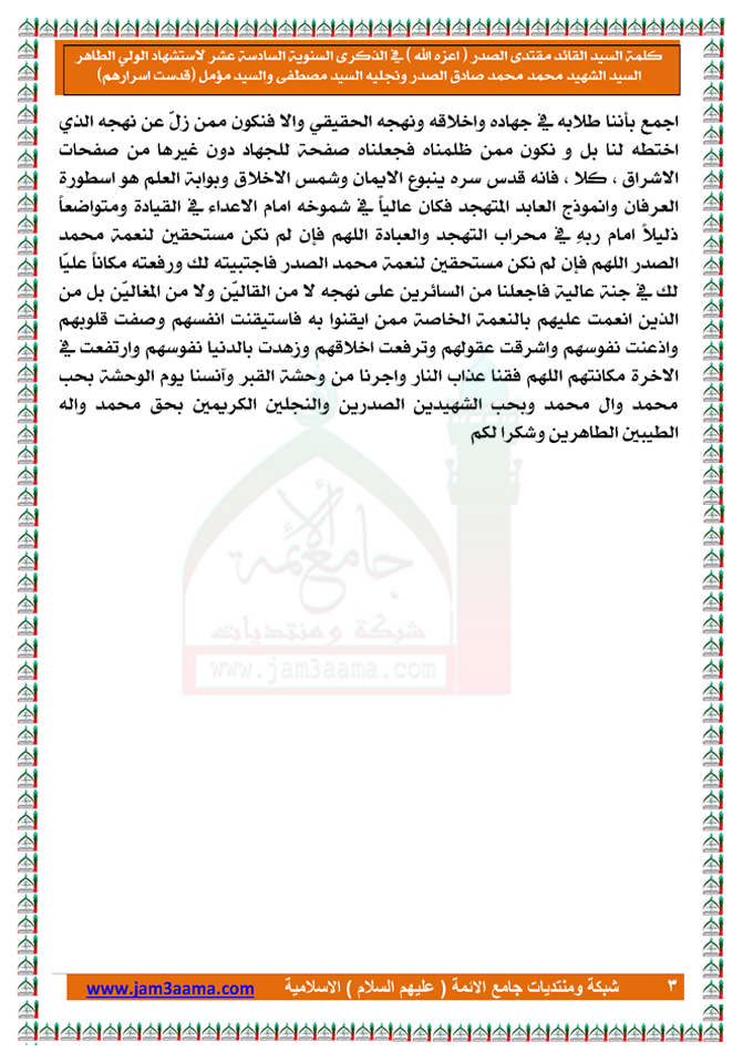 رد: نص كلمة سماحة السيد القائد مقتدى الصدر اعزه الله في الذكرى ( 16 ) لاستشهاد السيد الشهيد محمد محمد صادق الصدر ونجليه ( قدست اسرارهم )