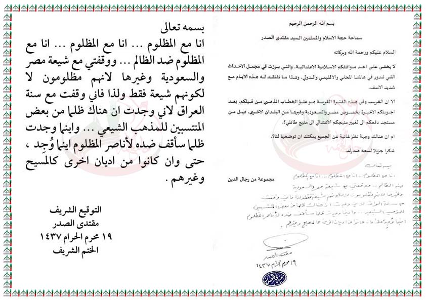 وقفتي مع شيعة مصر والسعودية وغيرها لانهم مظلومون لا لكونهم شيعة فقط استفتاء السيد القائد مقتدى الصدر اعزه الله 2 - 11 - 2015