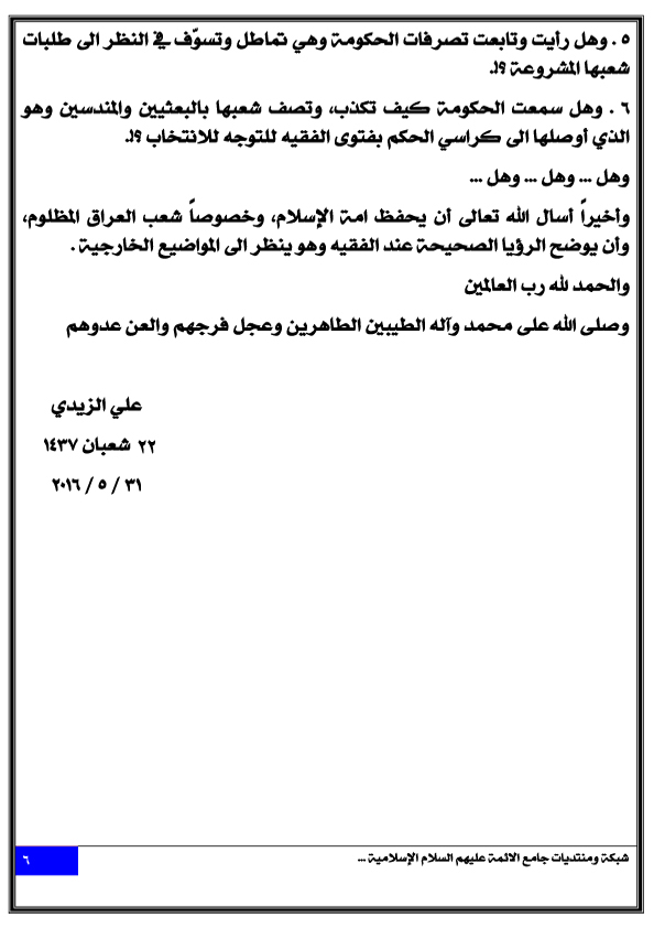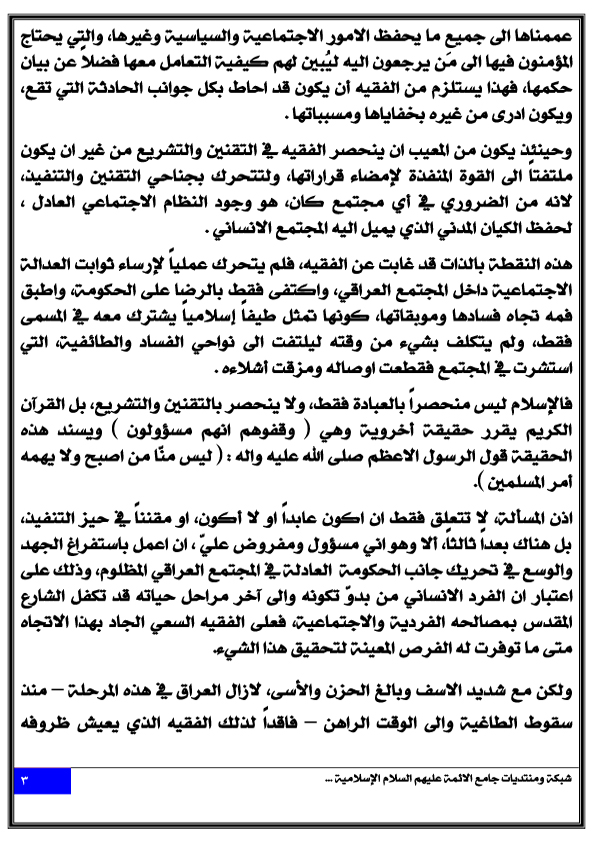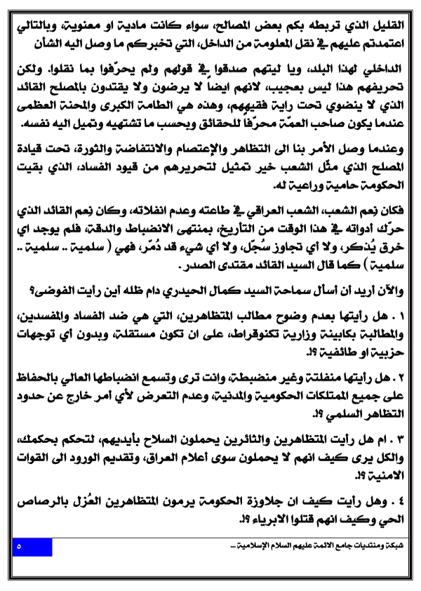 الى سماحة السيد كمال الحيدري والعلاقة بالموضوع الخارجي بقلم / الاستاذ علي الزيدي كثيرٌ هم من نعتوا تظاهر وإعتصام وإنتفاضة الشعب العراقي بانها خارجة عن القانون، ووصفوهم بالمندسين والبعثيين ، والذي تكلم بهذا الكلام انما تكلم بدافع الحقد والكراهية وخوفاً على مصالحه ، فلم نردّ عليهم كونهم لا يستحقون الرد .ولكن عندما يصل الأمر الى سماحة السيد كمال الحيدري دام ظله ، ذلك العَلَم في العِلم والأخلاق والبحث عن الحقيقة ، والذي اعتقدنا بانه قد ظُلِم من رجال الحوزة ، عندما شنت عليه هجمة شرسة، حاولوا من خلالها التسقيط، فعاش تجربة مرارة هذه المظلومية وهو يحاول الدفاع عن نفسه، وبيان مبانيه بشكل تفصيلي، من اجل توضيح الصورة، ورفع أي أشتباه يُثار حول آرائه واستدلالاته. والشيء الغريب أن يتحول سماحته من مظلوم الى ظالم، يتّهم الآخرين بما ليس فيهم، ومن ثم يسيء الظن بهم ، وهو لم يكن معهم ، ولم يشاركهم آثار محنة البلاء الذي جثم على صدورهم من تلك الحكومة الفاسدة، بحيث عاش الشعب اقسى وامرّ معاني الألم والحزن والحرمان والقسوة، فيصفهم بالفوضويين، بالرغم من أن العالم كلّه قد سمع بمطالبهم واقرّها لهم ، بعد أن رأوا انضباطهم العالي، الذي قلّ نظيره في العالم المتمدن فضلاً عن غيره من الدول . فحركة التظاهر والإعتصام والإنتفاضة والثورة التي حدثت مؤخراً في العراق ما هي إلّا نتيجة طبيعية أفرزتها الطرق الملتوية من قبل الحكومة، والضغط غير المنصف على الشعب، مضافاً الى الفساد المستشري الذي اوصل العراق الى هاوية لا يعرف نتائجها المستقبلية إلّا الله تعالى . ثم أن أمر التظاهر والإنتفاضة والثورة، قد اجتمعت فيه الجهتان الموضوعية والطريقية، فأما موضوعيته فإن تغيير النفس برفضها للظلم والفساد، هو شرف يسعى من خلاله الفرد لتزكية نفسه أمام الله عزّ وجلّ فهو أمر محبوب لذاته، وأما طريقيته فلأنه ينهي الفساد والظلم ويُثبت العدالة في المجتمع، فيكون التظاهر والإنتفاضة والثورة ( علّة معدّة ) و ( مقتضى ) لتغيير الحال، كما قال تعالى : {إِنَّ اللَّهَ لَا يُغَيِّرُ مَا بِقَوْمٍ حَتَّى يُغَيِّرُوا مَا بِأَنْفُسِهِمْ} [الرعد : 11]. مضافاً الى ان ما حدث من حِراك داخل المجتمع العراقي هو أحد المواضيع الخارجية التي ليس للفقيه حصة منها، لتكون تحت يديه، وهو بعيد عنها، نائياً منها، لم يرها ولم يعش احداثها، فقط سماع لا غير، ويا ليته سماع يحمل جنبة الصدق والامانة، ليكون متمماً للحجة الشرعية، التي يتم من خلالها أصدار الأحكام والقرارات . واما الرجوع الى رواة الاحاديث ( الفقهاء ) انما يرتبط بمجال تخصصهم وهو الاستنباط من الروايات، وما يُستنبط من الروايات هو الأحكام الشرعية، وأما تشخيص الموضوع الخارجي، فلا يرتبط بإطارها، حتى يتم ارجاعه الى راوي الحديث. ولذا فأن الفقهاء هم حجة شرعية فيما يرتبط بنقل الروايات والاستنباط منها، وأما في تشخيص المواضيع الخارجية، فلا يجب الرجوع اليهم . اما اذا تم الاعتراض بما جاء في التوقيع الشريف للإمام المهدي عليه السلام وهو يجيب عن بعض المسائل : ( وأما الحوادث الواقعة فأرجعوا فيها الى رواة حديثنا فأنهم حجتي عليكم وانا حجة الله عليهم )، فإننا اذا لم نعتبر الحوادث المتعلقة بأحكام الشريعة المستنبطة من الروايات هي المقصودة من هذا الجواب فقط بل عممناها الى جميع ما يحفظ الامور الاجتماعية والسياسية وغيرها، والتي يحتاج المؤمنون فيها الى مَن يرجعون اليه ليُبين لهم كيفية التعامل معها فضلاً عن بيان حكمها، فهذا يستلزم من الفقيه أن يكون قد احاط بكل جوانب الحادثة التي تقع، ويكون ادرى من غيره بخفاياها ومسبباتها . وحينئذ يكون من المعيب ان ينحصر الفقيه في التقنين والتشريع من غير ان يكون ملتفتاً الى القوة المنفذة لإمضاء قراراتها، ولتتحرك بجناحي التقنين والتنفيذ، لانه من الضروري في أي مجتمع كان، هو وجود النظام الاجتماعي العادل ، لحفظ الكيان المدني الذي يميل اليه المجتمع الانساني . هذه النقطة بالذات قد غابت عن ال