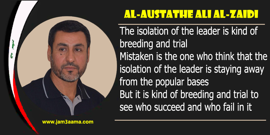 The isolation of the leader is kind of breeding and trial Mistaken is the one who think that the isolation of the leader is staying away from the popular bases But it is kind of breeding and trial to see who succeed and who fail in it Al-Austathe Ali Al-Zaidi ــــــــــــــــــــــــــــــــــــــــــــ http://www.jam3aama.com/up/do.php?img=7779 |
