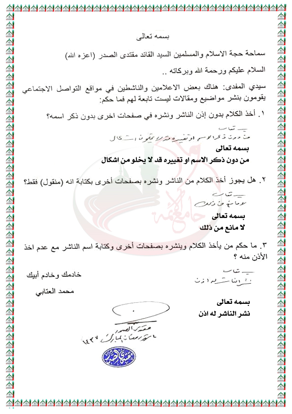 اسئلة حول قيام ناشطين واعلاميين بنشر مواضيع الآخرين على مواقع التواصل الاجتماعي استفتاء السيد القائد مقتدى الصدر اعزه الله 13 / 6 / 2016