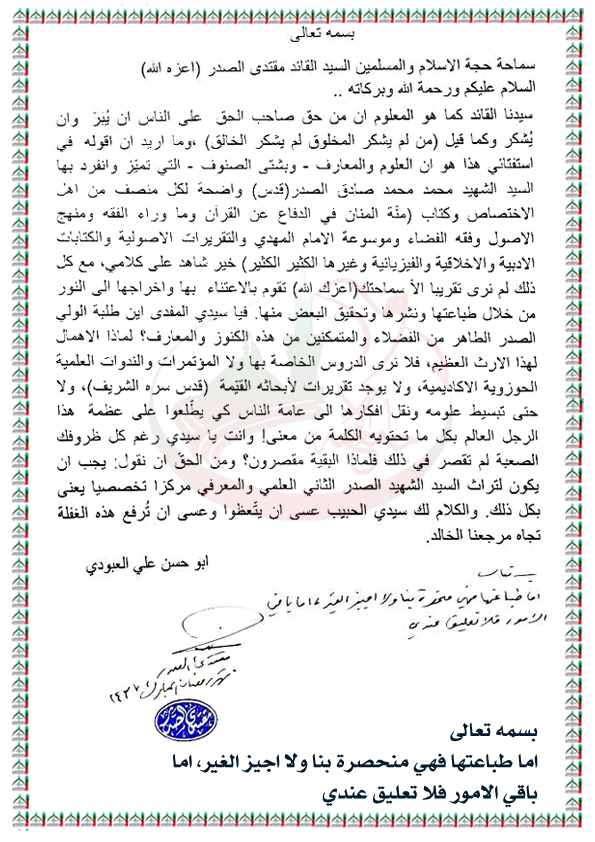 الاهمال للإرث العلمي للسيد الشهيد الصدر(قدس) من قبل طلابه استفتاء السيد القائد مقتدى الصدر اعزه الله 13 / 6 / 2016