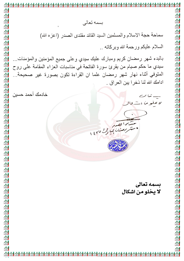 حكم قراءة سورة الفاتحة بصورة غير صحيحة في مجالس العزاء للمتوفين في نهار شهر رمضان المبارك استفتاء السيد القائد مقتدى الصدر اعزه الله 20 / 6 / 2016