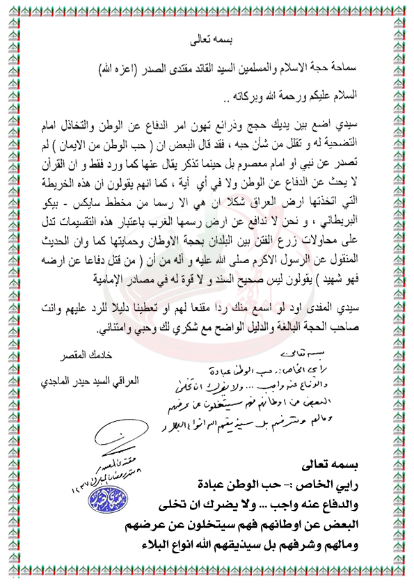 الذين يتخلون عن اوطانهم فهم سيتخلون عن عرضهم ومالهم وشرفهم استفتاء السيد القائد مقتدى الصدر اعزه الله 25 / 6 / 2016