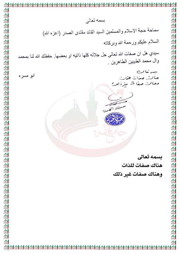 صفات الله جل جلاله كلها ذاتية او بعضها استفتاء السيد القائد مقتدى الصدر اعزه الله 27 / 6 / 2016