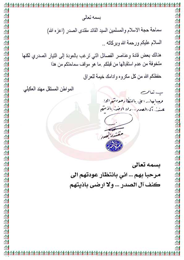 رغبة بعض قادة وعناصر من الفصائل بالعودة الى كنف آل الصدر لكنها متخوفة من عدم استقبالها استفتاء السيد القائد مقتدى الصدر اعزه الله 17 / 7 / 2016