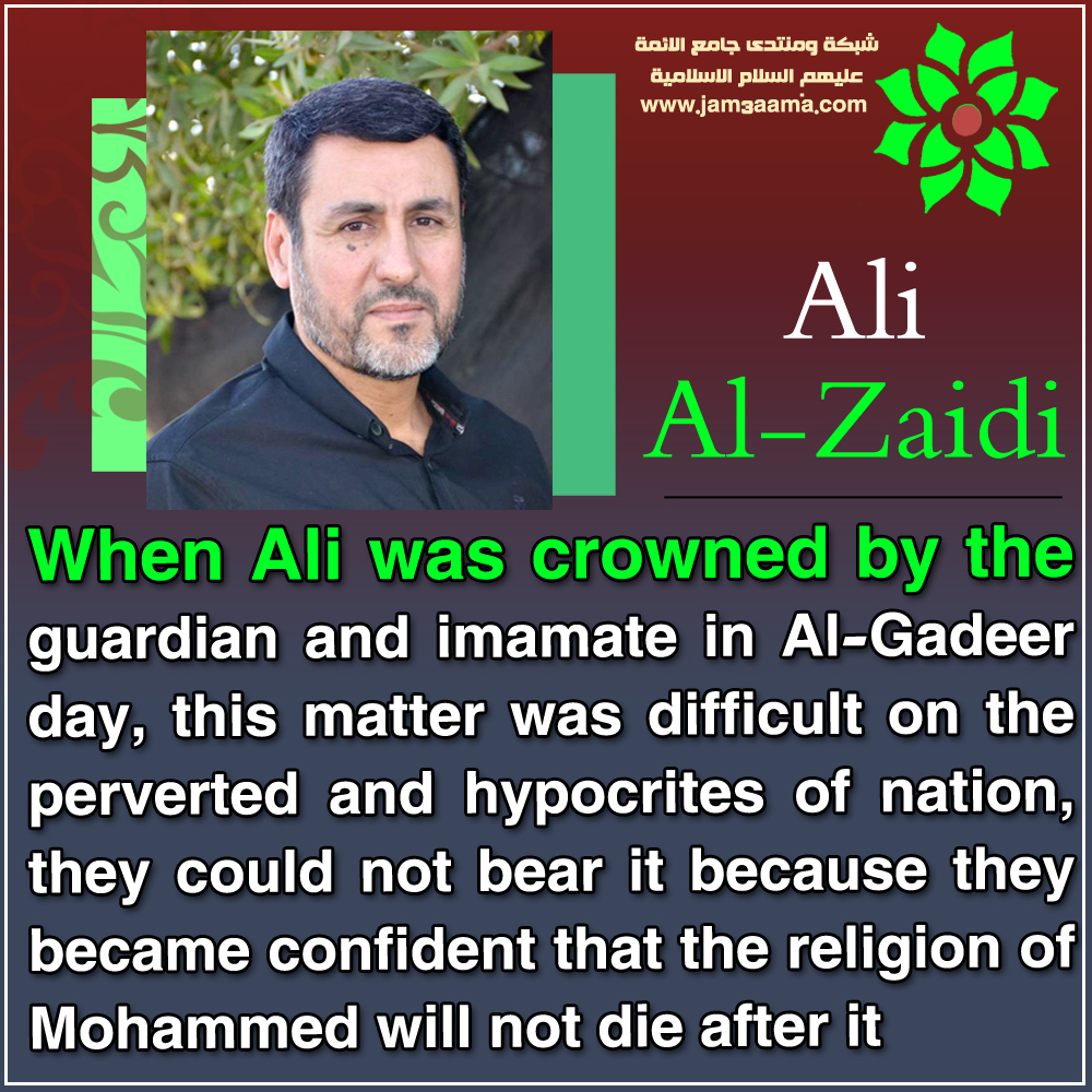 When Ali was crowned by the guardian and imamate in Al-Gadeer day \By Ali Al-Zaidi When Ali was crowned by the guardian and imamate in Al-Gadeer day, this matter was difficult on the perverted and hypocrites of nation, they could not bear it because they became confident that the religion of Mohammed will not die after it Ali Al-Zaidi http://www.jam3aama.com/up/do.php?img=8676 |
