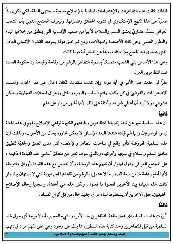 ويمكن الإجابة على هذا التساؤل بما يلي : أولاً: حاولت امريكا وبعض دول الجوار إيجاد عدّة محركات، الغرض منها ترسيخ شعور إقليمي وعالمي، يرتكز على أن الشعب العراقي هو شعب غير حضاري، وأنّه يعشق ويلتذ بالدماء والتخريب، ويغرق في بحر عميق من الفوضى، مضافاً الى جهله بما فيه صلاح أمره، وبالتالي يستطيعون إيجاد المسوغ والمبرر القانوني للتدخل بالشأن الداخلي لهذا البلد، وإن كان مبطنا بعناوين إنسانية يبارك فيها الرأي العام، أو حتى لو كانت تجاوزات وخروقات، لكن بوجود إتفاقات بين الدول المستفيدة من تمزيق العراق، يتم التغاضي عنها لوجود المصالح المشتركة بينها . فلذلك كانت هذه التظاهرات والإعتصامات المطالبة بالإصلاح سلمية وبمنتهى الدقة، لكي تكون ردّاً عملياً على هذا النهج الإستكباري في تشويه الحقائق وتضليلها، وليعرف المجتمع الدولي بأن الشعب العراقي شعبٌ حضاريٌ يعشق السلم والسلام، لأنهما من صميم الإنسانية التي ينطلق من خلالهما البناء والتطور العلمي وعلى كافة الأصعدة والمجالات، ومن ثم خلق دولة يسودها القانون الإنساني العادل الذي يتساوى فيه الجميع بلا استثناء بعيداً عن تدخل أية دولة كانت . وعلى هذا الأساس بقي الشعب متمسكاً بسلمية التظاهر بالرغم من وقاحة وقباحة رد حكومة الفساد ضد المتظاهرين العزل . علماً لو حدث هذا الأمر في أية دولة وإن كانت متقدمة، لكان الحال غير هذا الحال، ولعمت الإضطرابات والفوضى في كل مكان، ولتم السلب والنهب والقتل وإحراق المحلات التجارية وبشكل عشوائي، ولا أريد أن أعطي شواهد وأمثلة على ذلك لأنها أشهر من نار على علم . ثانياً: ان هذه السلمية تعبر عن شدة إنضباط المتظاهرين وطاعتهم الكبيرة لراعي الإصلاح، فهم في هذه الحالة ليسوا فوضويين وإنما لهم قيادة عندها البعد الإنساني لا يمكن تجاوزه بحال من الأحوال، ولذلك فإن هذه السلمية المفروضة كأمر واقع في ساحات التظاهر والإعتصام تمثل مدى العمق والجديّة لتطبيق مبادئ السلم والسلام في نهجها وتحركها، وبالتالي سوف تعبر عن منطلق أساسي عند القيادة الحكيمة ، على المجتمع العراقي ودول الجوار أن تفهم هذه الرسالة، وأن تتعامل مع هذه القيادة بأوراق مفتوحة، لأنها أمام زعامة لها من سعة الصدر ما لا يحتمل، بالرغم من قاعدتها الجماهيرية التي لا يستهان بها، ولو كانت هذه القيادة بيد الآخرين لفعلوا ما فعلوا . ولكن هذه هي أخلاق وسجايا رجال الإصلاح الحقيقيين، فعلى الآخرين أن يستغلوها لبناء عراق جديد خال من كل أنواع الفساد . ثالثاً: أبرزت هذه السلمية مدى عمق طاعة المتظاهرين لهذا الأمر، والشيء العجيب أنه لا يوجد أي خرق لهذه السلمية من قبل المتظاهرين ولحد كتابة هذه السطور، مما يدل على وجود وعي عالٍ لفهم مراد قيادتهم، هذا بالتالي سيجعل من المتظاهرين أن يكونوا مؤهلين لطاعة الأمور الأشد والأصعب من هذا الأمر، وذلك لأن الإنسان كلما إستطاع أن ينجح في أمر ما، إستحق أن يصل الى إستحقاق آخر ولمرتبة أعلى تكون أكثر توفيقاً وأوفر حظاً في كسب المنجزات الإصلاحية سواء على مستوى الشدة والعمق أو السعة والشمول . وذلك لأن الطاعة – ( وأنا أقصد الطاعة الحقة وليست طاعة الشيطان فإن لها أيضاً مراتب تسافلية ) – هي مرتبة من مراتب الكمال والرقي الإنساني، كلما إشتدت لدى الفرد تنفتح أمامه سبل الهداية والتوفيق بشكل أوسع وأكبر، وحينها سيرى من الخير ما لا عين رأت ولا أذن سمعت ولا خطر على قلب بشر . وأريد أن أشير هنا بما يناسب المقام بأن علياً عليه السلام ما كان ليصبح علياً لولا طاعته لرسول الله صلى الله عليه وآله . رابعاً: إن ثبات المتظاهرين العزل أمام هجوم جلاوزة الفاسدين بالأسلحة النارية – بالرغم من سقوط الشهداء والجرحى- وبقاءهم في مكان التظاهر مع شدة الموقف وصعوبته، والصبر على أفعال حكومة الفساد الهمجية، يدل على وصول المتظاهرين الى مرتبة من مراتب الشجاعة والصبر على الشدائد، لا يمكن الإستهانة بها وتقليل شأنها . فهي لعمري مرحلة من مراحل التضحية العالية لديهم، كانوا 
