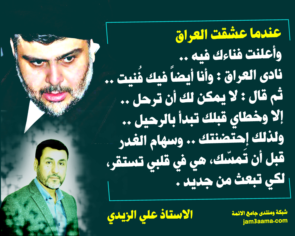 نحن كلنا فداء لقائد العراق السيد مقتدى الصدر اطال الله عمره وحفظه من كل سوء وحيا الله استاذنا الفاضل علي الزيدي على هذه الكلمات الرائعة