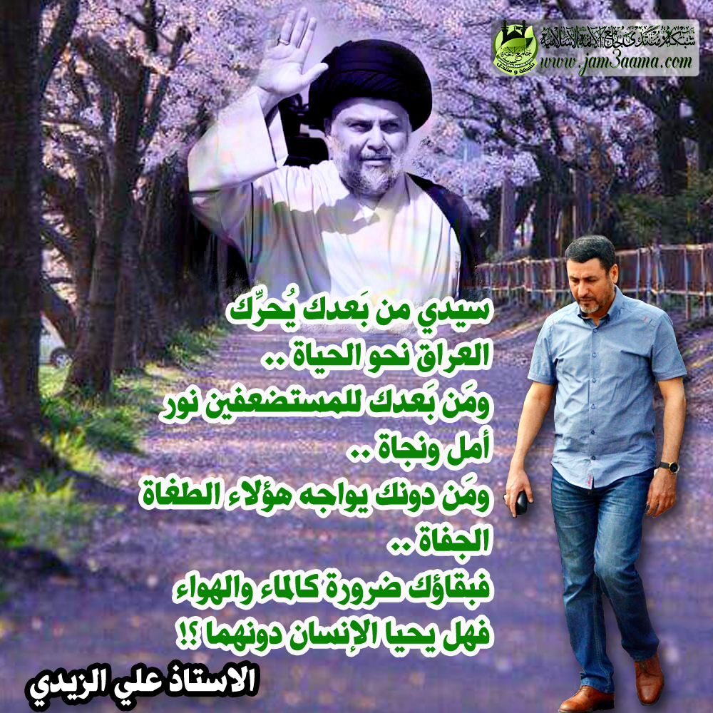 سيدي مَن بَعدك يُحرِّك العراق نحو الحياة .. ومَن بَعدك للمستضعفين نور أمل ونجاة .. ومَن دونك يواجه هؤلاء الطغاة الجفاة .. فبقاؤك ضرورة كالماء والهواء فهل يحيا الإنسان دونهما ؟! الاستاذ الفاضل علي الزيدي ـــــــــــــــــــــــــــــــــــــــــ |