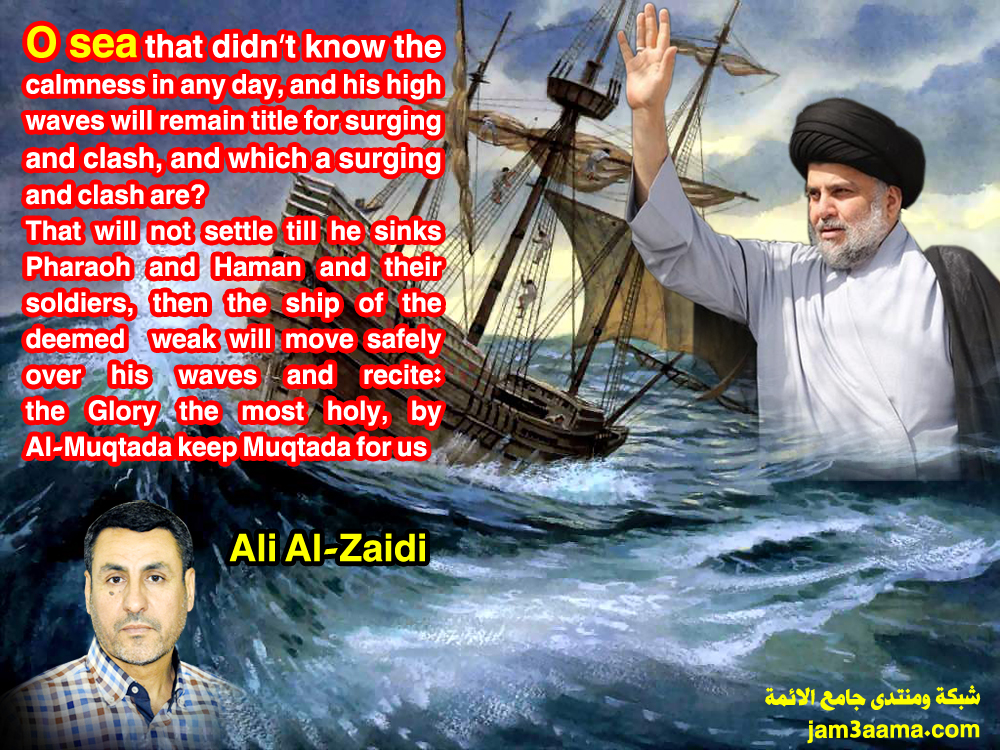 O sea…By Ali Al-Zaidi O sea that didn’t know the calmness in any day, and his high waves will remain title for surging and clash, and which a surging and clash are? That will not settle till he sinks Pharaoh and Haman and their soldiers, then the ship of the deemed weak will move safely over his waves and recite: the Glory the most holy, by Al-Muqtada keep Muqtada for us Ali Al-Zaidi http://www.jam3aama.com/up/do.php?img=8899 |