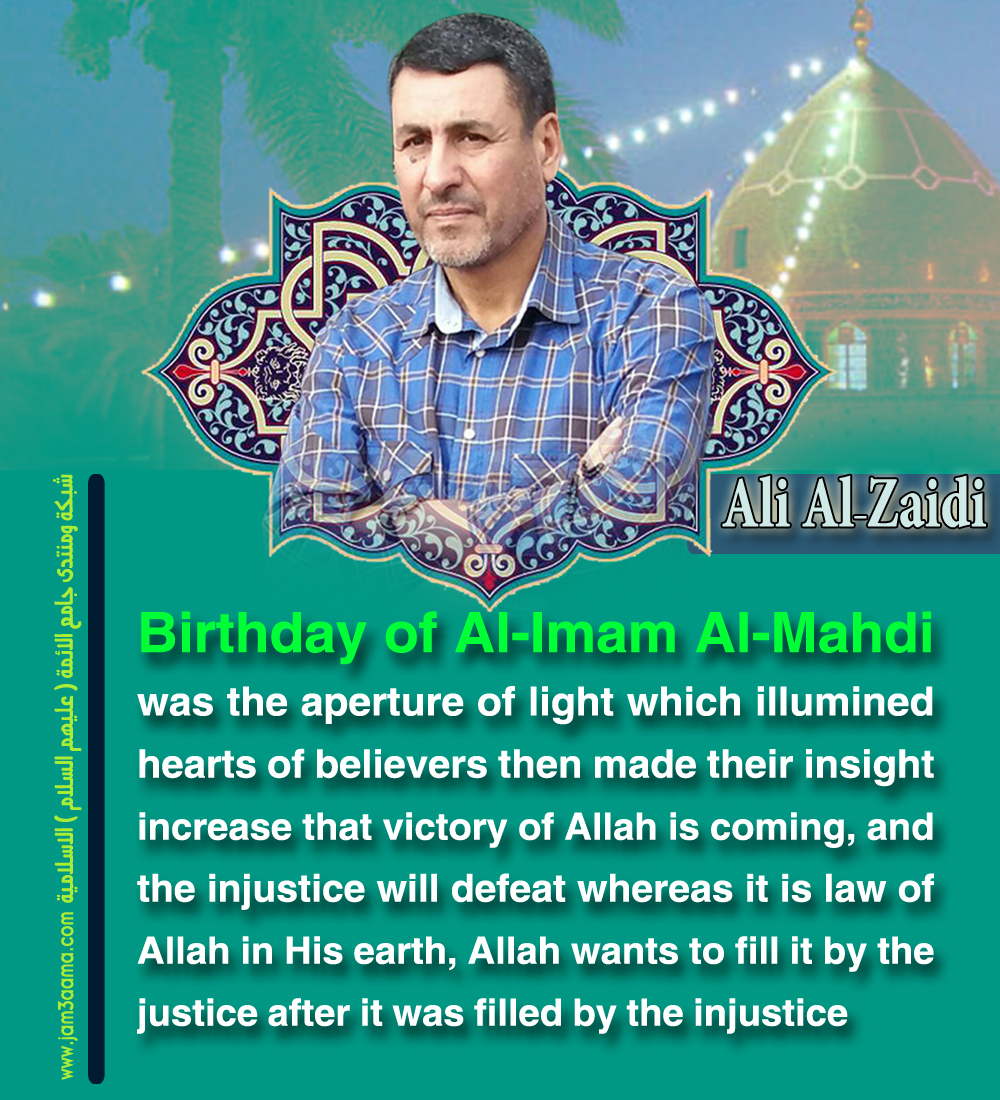Birthday of Al-Imam Al-Mahdi was the aperture of light which illumined hearts of believers\ By Ali Al-Zaidi Birthday of Al-Imam Al-Mahdi was the aperture of light which illumined hearts of believers then made their insight increase that victory of Allah is coming, and the injustice will defeat whereas it is law of Allah in His earth, Allah wants to fill it by the justice after it was filled by the injustice Ali Al-Zaidi ــــــــــــــــــــــــــــــــhttp://www.jam3aama.com/up/do.php?img=8949 |