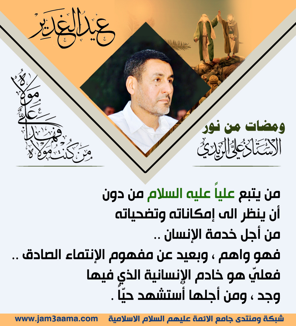 من يتبع علياً عليه السلام من دون أن ينظر الى إمكاناته وتضحياته من أجل خدمة الإنسان .. فهو واهم ، وبعيد عن مفهوم الإنتماء الصادق .. فعليّ هو خادم الإنسانية الذي فيها وجد ، ومن أجلها أُستشهد حيّاً . الاستاذ الفاضل علي الزيدي ــــــــــــــــــــــــــ http://www.jam3aama.com/up/do.php?img=9016 |