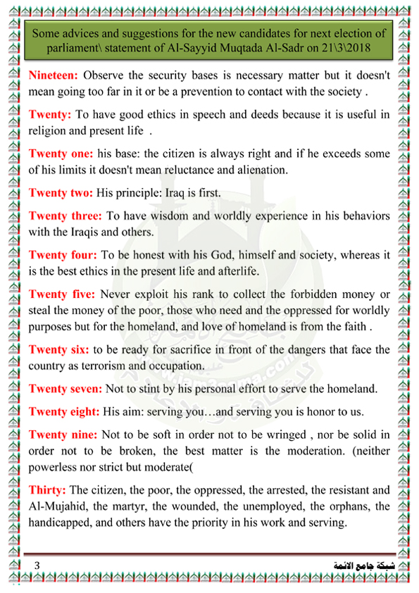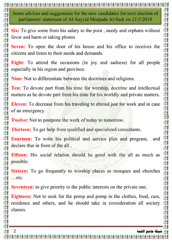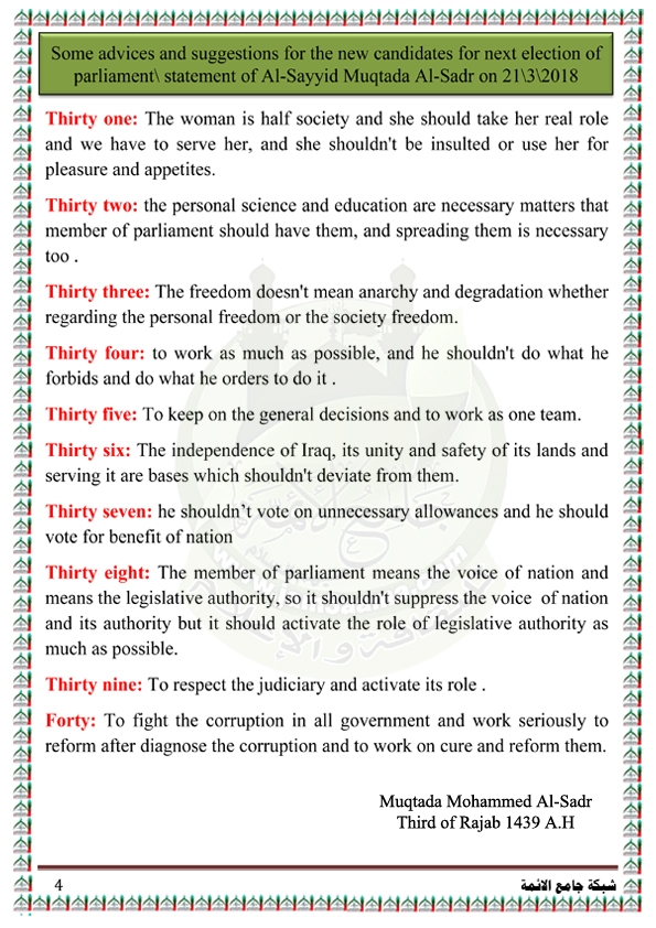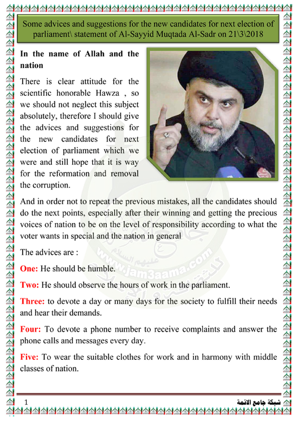 Some advices and suggestions for the new candidates for next election of parliament \ statement of Al-Sayyid Muqtada Al-Sadr on 21\3\2018