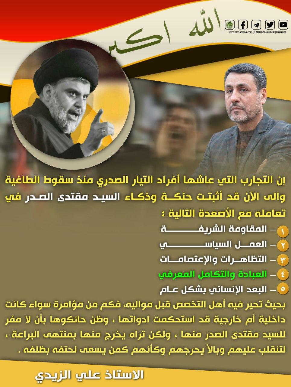 رد: إن التجارب التي عاشها أفراد التيار الصدري منذ سقوط الطاغية والى الآن قد أثبتت حنكة وذكاء السيد مقتدى الصدر ... الاستاذ علي الزيدي