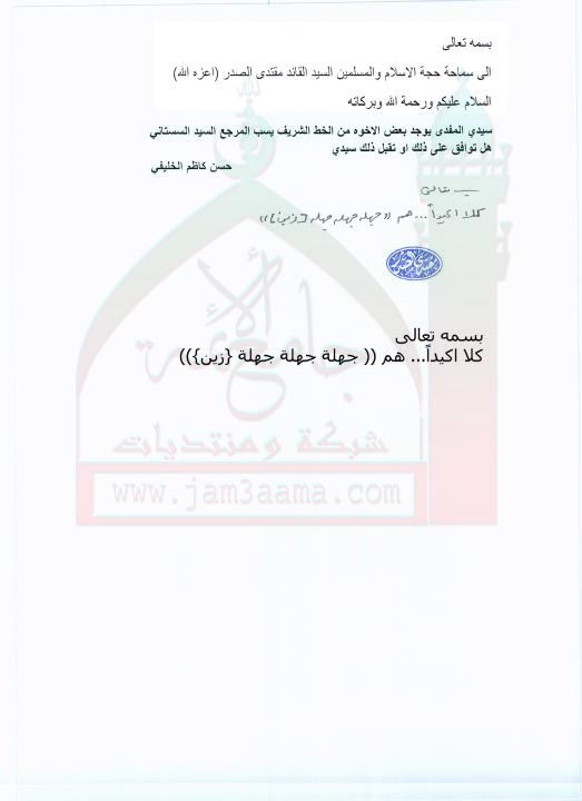 لا اوافق على سب السيد السيستاني اكيدا...والذين يفعلون ذلك هم (جهلة جهلة جهلة)(استفتاء للسيد القائد مقتدى الصدر اعزه الله بتاريخ 14-8-2011)