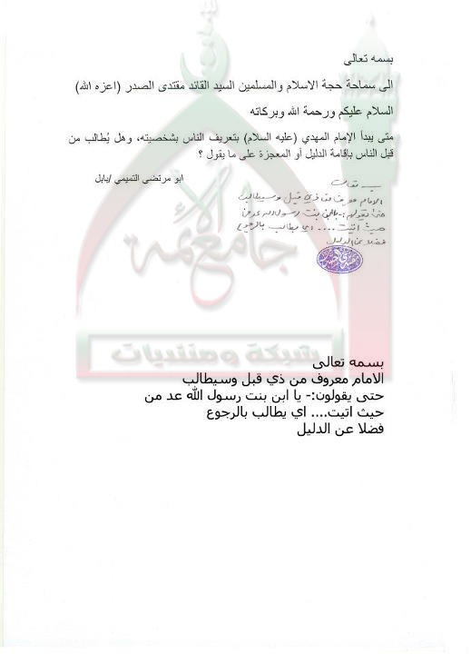 اوان وكيفية تعريف الامام المهدي ( عجل الله فرجه ) عن شخصه للناس استفتاء للسيد القائد مقتدى الصدر اعزه الله 28 - 10 - 2011