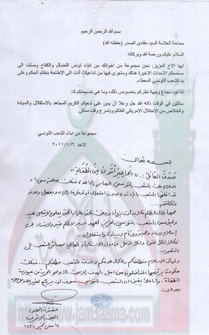 جواب السيد القائد مقتدى الصدر اعزه الله على رسالة بعثها بعض من الشباب التونسي