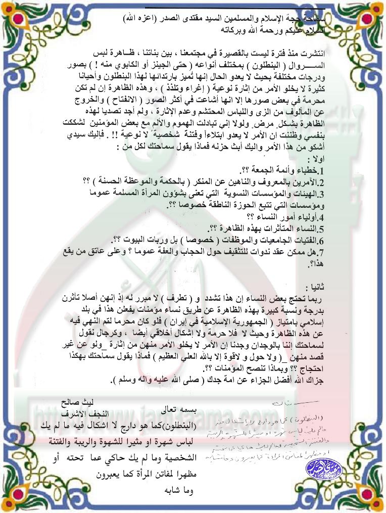لبس النساء للبنطرون استفتاء سماحة السيد القائد مقتدى الصدر اعزه الله 29 - 1 - 2011