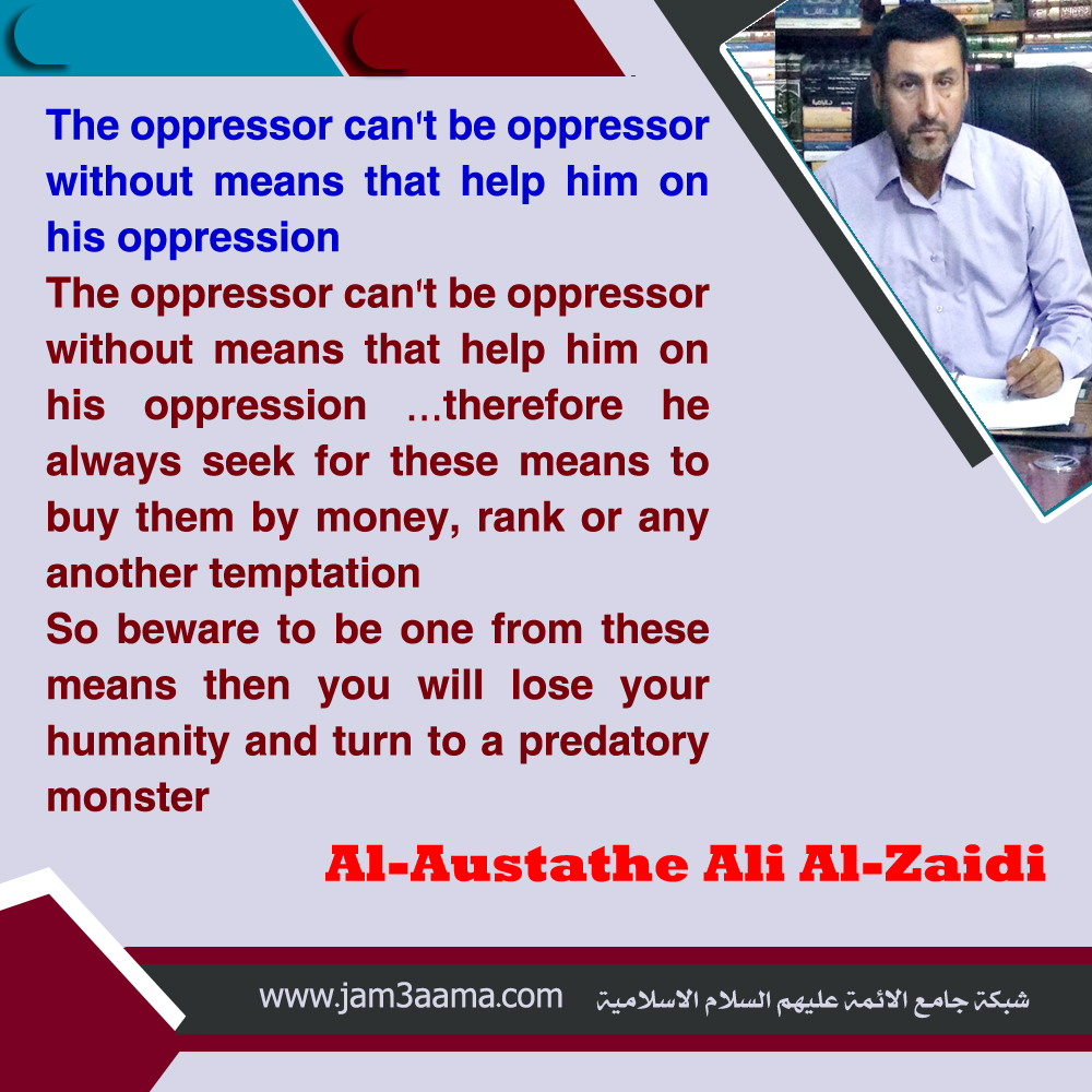The oppressor can't be oppressor without means that help him on his oppression The oppressor can't be oppressor without means that help him on his oppression …therefore he always seek for these means to buy them by money, rank or any another temptation So beware to be one from these means then you will lose your humanity and turn to a predatory monster Al-Austathe Ali Al-Zaidi ÜÜÜÜÜÜÜÜÜÜÜÜÜÜÜÜÜÜÜÜÜÜÜÜÜÜÜÜÜÜÜÜÜ http://www.jam3aama.com/up/do.php?img=7774 |