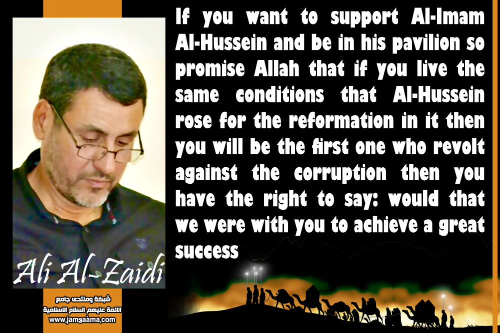 If you want to support Al-Imam Al-Hussein and be in his pavilion If you want to support Al-Imam Al-Hussein and be in his pavilion so promise Allah that if you live the same conditions that Al-Hussein rose for the reformation in it then you will be the first one who revolt against the corruption then you have the right to say: would that we were with you to achieve a great success Ali Al-Zaidi ـــــــــــــــــــــــــــــــــــــ http://www.jam3aama.com/up/do.php?img=8734 |