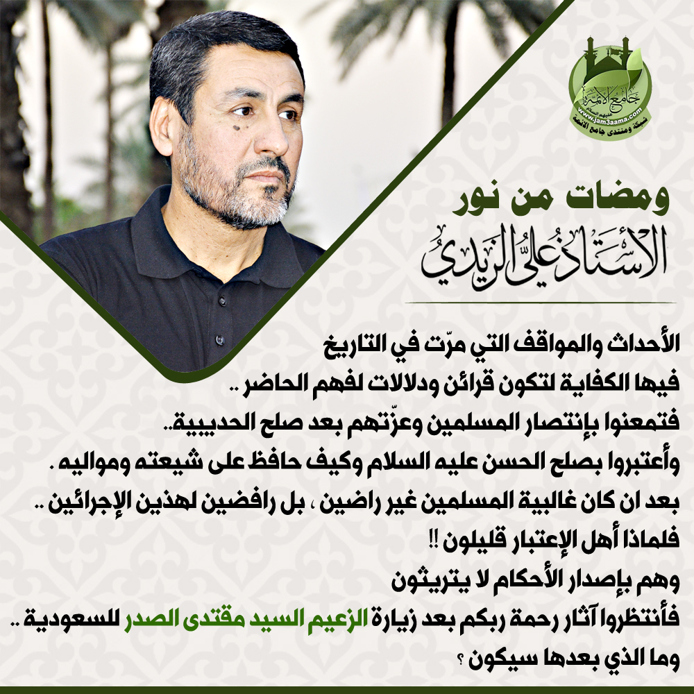 الأحداث والمواقف التي مرّت في التاريخ فيها الكفاية لتكون قرائن ودلالات لفهم الحاضر .. فتمعنوا بإنتصار المسلمين وعزّتهم بعد صلح الحديبية.. وأعتبروا بصلح الحسن عليه السلام وكيف حافظ على شيعته ومواليه . بعد ان كان غالبية المسلمين غير راضين ، بل رافضين لهذين الإجرائين .. فلماذا أهل الإعتبار قليلون !! وهم بإصدار الأحكام لا يتريثون فأنتظروا آثار رحمة ربكم بعد زيارة الزعيم السيد مقتدى الصدر للسعودية .. وما الذي بعدها سيكون ؟ الاستاذ الفاضل علي الزيدي _____________________ http://www.jam3aama.com/up/do.php?img=8985 |
