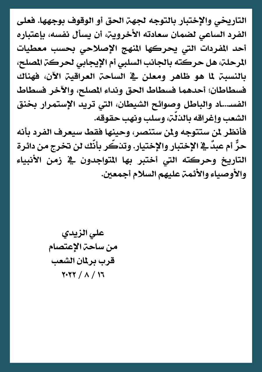 وهذا الأمر- أي مرحلة الإختبار وثم الإختيار- الذي لا يمكن أن يمرّ بمرحلة من التاريخ دون غيرها، وذلك بإعتبار العدل الإلهي من جهة، والتغاير في الصور والتشخصات من جهة أخرى. وعلى هذا الأمر يدور الزمن وتتحرك المصاديق. فكما كان في السابق أنبياء وقد أختبرت بهم أممهم وشعوبهم، ولحقهم الأوصياء بنفس منهج الإختبار، وإن تغيرت مواقفه، وجاء بعدهم علماء الدين والقادة المصلحين وكلٌّ قد أدّى دوره الإصلاحي بإسماع صوت الحق فكان له أتباع ومخلصين لدعوته، وفي الطرف الآخر أعداء ومناوئين، وكلّ سيأخذ نصيبه من حجم المعصية للحق والهداية، ومن حجم الطاعة لهما. وسيتساوى ثواب الطاعة وعقاب المعصية لكل المعاصرين للأنبياء والأوصياء والقادة الإلهيين، لا يستثنى زمن دون زمن آخر. وبما أنَّ مرحلتنا الراهنة لا يمكن أن تستثنى من هذا التسلسل التاريخي والإختبار بالتوجه لجهة الحق أو الوقوف بوجهها. فعلى الفرد الساعي لضمان سعادته الأخروية، أن يسأل نفسه، بإعتباره أحد المفردات التي يحركها المنهج الإصلاحي بحسب معطيات المرحلة، هل حركته بالجانب السلبي أم الإيجابي لحركة المصلح، بالنسبة لما هو ظاهر ومعلن في الساحة العراقية الآن، فهناك فسطاطان؛ أحدهما فسطاط الحق ونداء المصلح، والآخر فسطاط الفسـ...ـاد والباطل وصوائح الشيطان، التي تريد الإستمرار بخنق الشعب وإغراقه بالذلّة، وسلب ونهب حقوقه. فأنظر لمن ستتوجه ولمن ستنصر، وحينها فقط سيعرف الفرد بأنه حرٌّ أم عبدٌ في الإختبار والإختيار. وتذكّر بأنّك لن تخرج من دائرة التاريخ وحركته التي أختبر بها المتواجدون في زمن الأنبياء والأوصياء والأئمة عليهم السلام أجمعين. علي الزيدي من ساحة الإعتصام قرب برلمان الشعب 16 / 8 / 2022 http://www.jam3aama.com/up/do.php?img=10861 http://www.jam3aama.com/up/do.php?img=10863 |
